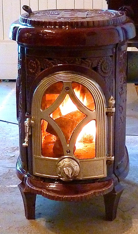 An den Fotos mit und ohne Feuer in diesem „Le non pareil“ Ofen kann man sehen, dass die jeweiligen Lichtverhältnisse den Farbton seiner Emaille recht stark verändern. Manchmal erscheint er in einem Farbton den wir als „Aubergine“ bezeichnen, manchmal aber eher in „Bordeaux“ rot.