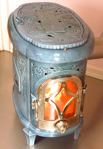 Der hellblaue „Le non pareil“ Jugendstil Ofen mit dem alles anfing.