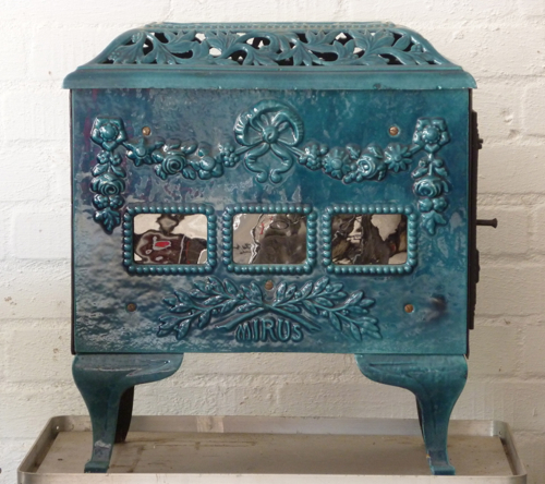Ein zierlicher Ofen dieser Mirus. In einer Farbe, die an bewegtes Meerwasser erinnert.